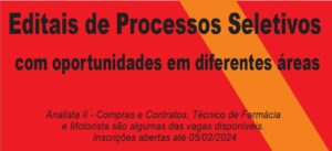 Analista II – Compras e Contratos, Técnico de Farmácia e Motorista são algumas das vagas disponíveis; Inscrições abertas até 05/02/2024 Autor: Luciane Paz Foto: Davidyson...